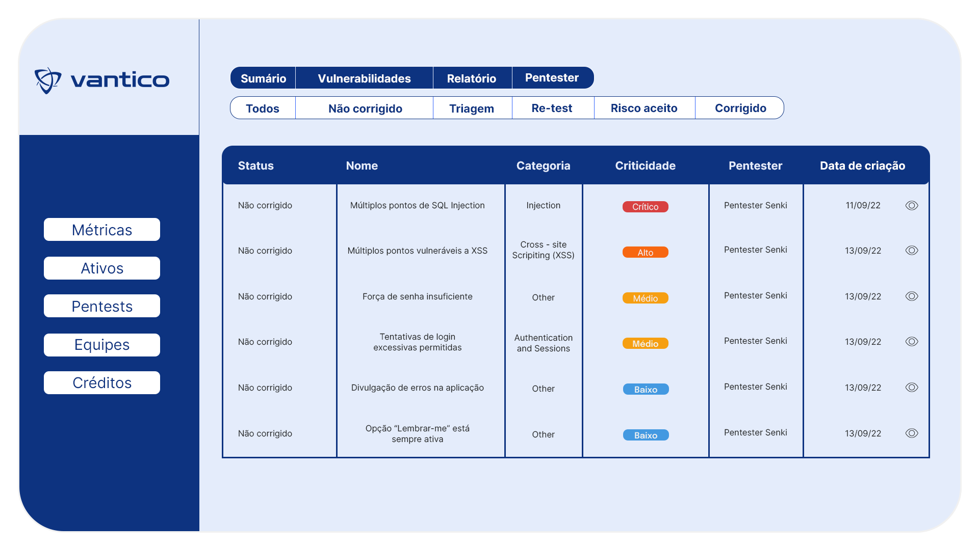 A Vantico também oferece o retest incluso dentro do processo de pentest. Ou seja, após a entrega e correção por parte do cliente, iremos realizar novamente os testes e verificar se, de fato, as vulnerabilidades foram totalmente sanadas.